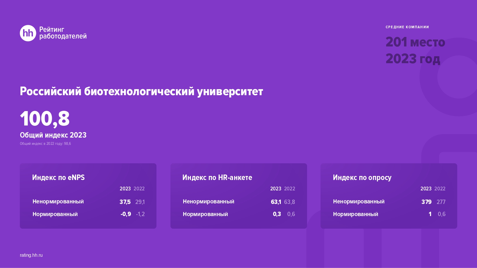 1 февраля 2024 Российский биотехнологический университет (Университет РОСБИОТЕХ) занял 201 место в рейтинге работодателей в категории «Средние компании», подготовленном компанией HeadHunter. Всего участвовали 2266 компаний, в финал вышли 1497.Рейтинг работодателей рассчитывается на основе мнения соискателей, уровня лояльности сотрудников и развития HR-процессов в компании.