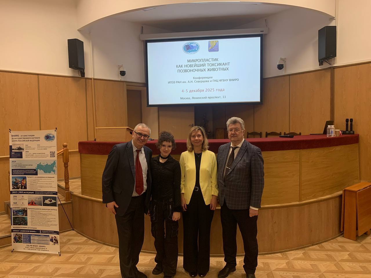 16 декабря 2025 Доцент кафедры биоэкологии и биологической безопасности Елена Слынько вместе со студентами направления «Биология» приняла участие в научно-практической конференции «Микропластик как новейший токсикант позвоночных животных», организованной Институтом проблем экологии и эволюции имени А.Н. Северцова РАН и Всероссийским НИИ рыбного хозяйства и океанографии (ФГБНУ «ВНИРО»). На мероприятии специалисты обсудили влияние микропластика на позвоночных, его распространение в водных и наземных экосистемах, накопление в трофических цепях, а также современные методы его обнаружения в биологических образцах.