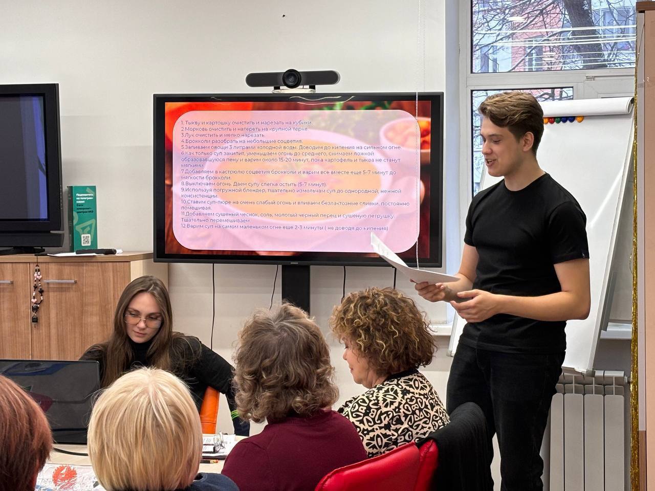 16 декабря 2025 Студенты 2 курса направления подготовки «Продукты питания из растительного сырья» провели мероприятие в коворкинг-центре НКО «Душевная Москва» с москвичами старшего возраста, пенсионерами. Гости попробовали суп долголетия и узнали его рецептуру.