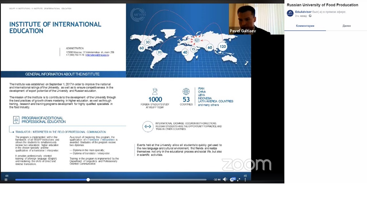 18 сентября 2020Институт международного образования МГУПП 18 сентября принял участие в вебинаре на платформе EduAdvisor, который проходил в рамках виртуальной выставки-ярмарки.