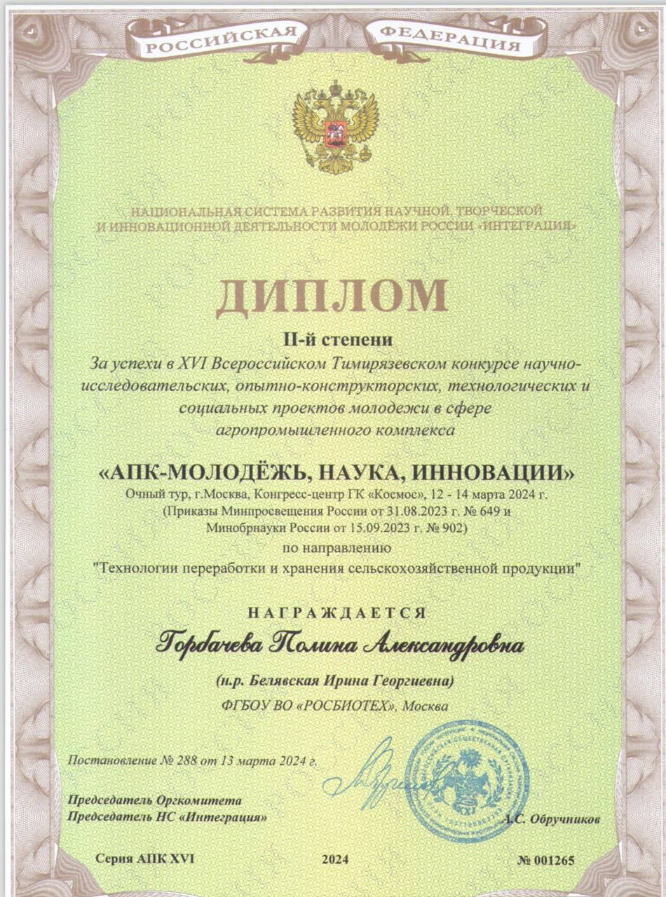 Студентка РОСБИОТЕХа Полина Горбачева была награждена в очном туре дипломом 2 степени за работу по направлению «Технологии переработки и хранения сельскохозяйственной продукции». Данная работа выполнялась под руководством научного руководителя — профессора кафедры зерна, хлебопекарных и кондитерских технологий, доктора технических наук Ирины Белявской. За успешную подготовку студентки научный руководитель также была награждена почетным дипломом.